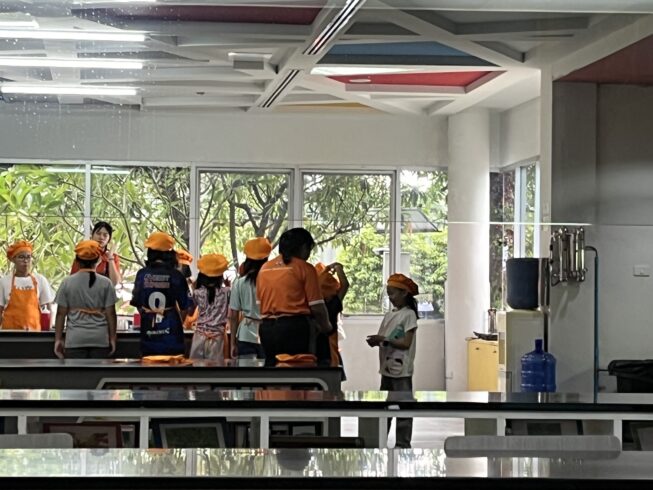 調理室に入れるのは子どものみで、エプロンと帽子を着用。手洗いの時間もしっかり確保されていて衛生的です。