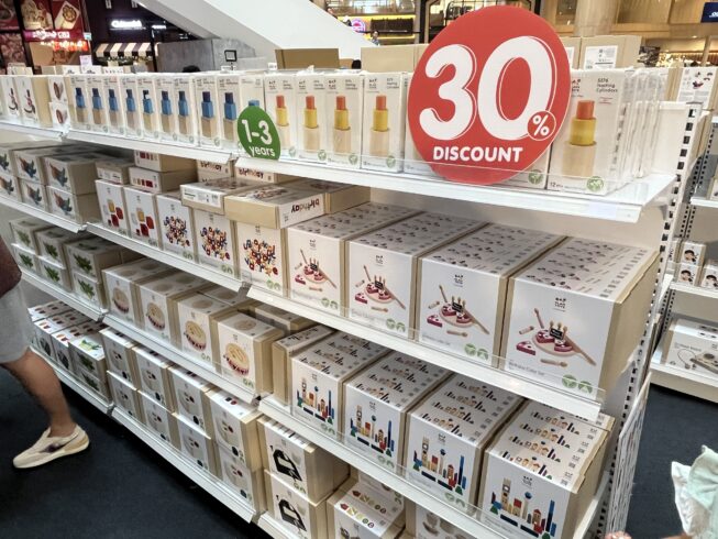 2025年は12月5日〜12月10日までの5日間、エカマイ駅直結の「Gateway Ekkamai」にて「PlanToys Playhouse Sale」というセールイベントが開催され、最大80%offと多くの木製おもちゃが大幅割引で販売されました。